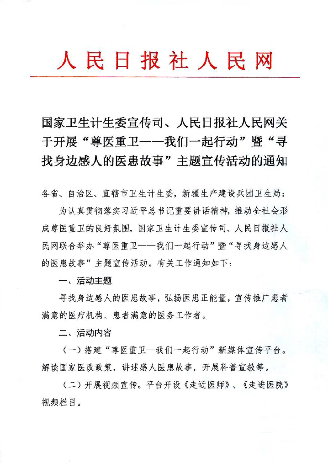 国家卫生计生委宣传司 人民日报人民网关于开展尊医重卫活动的通知